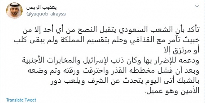 وقال في تغريدة عبر "تويتر" رصدها "المشهد العربي": "تأكد بأن الشعب السعودي يتقبل النصح من أي أحد إلا من خبيث تآمر مع القذافي وحلم بتقسيم المملكة ولم يبقى ... أو مرتزق إلا ودعمه للإضرار بها وكان ذنب لإسرائيل والمخابرات الأجنبية".