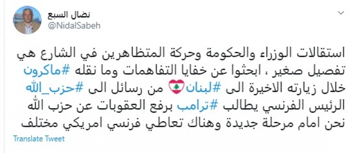 وكتب في تغريدة عبر "تويتر" رصدها "المشهد العربي": "استقالات الوزراء والحكومة وحركة المتظاهرين في الشارع هي تفصيل صغير، ابحثوا عن خفايا التفاهمات وما نقله ماكرون خلال زيارته الأخيرة إلى لبنان من رسائل إلى حزب الله".