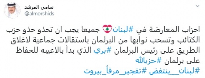 وقال في تغريدة عبر "تويتر" رصدها "المشهد العربي": "أحزاب المعارضة في لبنان جميعا يجب ان تحذو حذو حزب الكتائب وتسحب نوابها من البرلمان باستقالات جماعية لإغلاق الطريق على رئيس البرلمان بري الذي بدأ بالاعيبه للحفاظ على برلمان حزب الله".