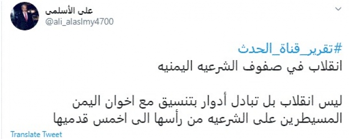 وأضاف: "ليس انقلاب بل تبادل أدوار بتنسيق مع إخوان اليمن المسيطرين على الشرعية من رأسها إلى أخمس قدميها".