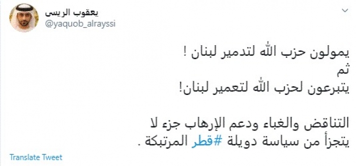 وجه الكاتب الإماراتي يعقوب الريسي، اليوم، انتقادًا لاذعًا لقطر جراء تمويلها لحزب الله اللبناني.