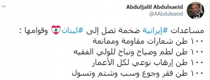 وكتب عبر تغريدة له على "تويتر" رصدها " المشهد العربي": "مساعدات إيرانية ضخمة تصل إلى لبنان وقوامها،١٠٠ طن شعارات مقاومة وممانعة،١٠٠ طن لطم وصياح ونباح للولي الفقيه، ١٠٠ طن إرهاب نوعي لكل الأعمار، ١٠٠ طن فقر وجوع وسب وشتم وتسول".