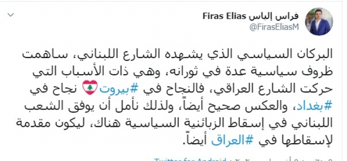 وكتب عبر تغريدة له على "تويتر" رصدها " المشهد العربي": "البركان السياسي الذي يشهده الشارع اللبناني، ساهمت ظروف سياسية عدة في ثورانه، وهي ذات الأسباب التي حركت الشارع العراقي، فالنجاح في بيروت نجاح في بغداد، والعكس صحيح أيضاً، ولذلك نأمل أن يوفق الشعب اللبناني في إسقاط الزبائنية السياسية هناك، ليكون مقدمة لإسقاطها في العراق أيضا".