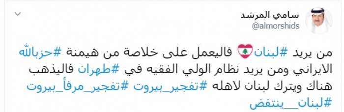 وكتب عبر تغريدة له على "تويتر" رصدها " المشهد العربي": "من يريد لبنان فليعمل على خلاصه من هيمنة حزب الله الإيراني ومن يريد نظام الولي الفقيه في طهران فليذهب هناك ويترك لبنان لأهله".