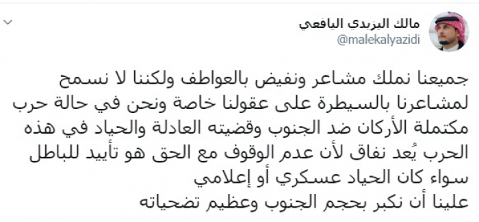 وكتب عبر تغريدة له على "تويتر" رصدها "المشهد العربي": "جميعنا نملك مشاعر ونفيض بالعواطف ولكننا لا نسمح لمشاعرنا بالسيطرة على عقولنا خاصة ونحن في حالة حرب مكتملة الأركان ضد الجنوب وقضيته العادلة، والحياد في هذه الحرب يُعد نفاقا لأن عدم الوقوف مع الحق هو تأييد للباطل سواء كان الحياد عسكريا أو إعلاميا، علينا أن نكبر بحجم الجنوب وعظيم تضحياته".