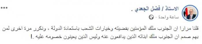 وكتب عبر تدوينة له على "فيس بوك" رصدها "المشهد العربي": "قلنا مرارا إن الجنوب ملك المؤمنين بقضيته وخيارات الشعب باستعادة الدولة، ونكرر مرة أخرى لمن بهم صمم، أن الجنوب ملك أبنائه الذين يدافعون عنه وليس الذين يعينون خصومه عليه".
