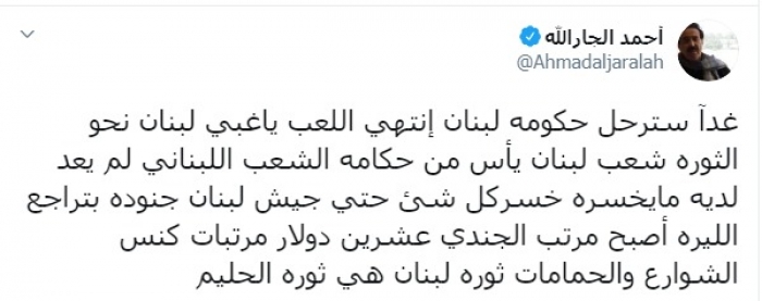 وكتب عبر تغريدة له على "تويتر" رصدها " المشهد العربي": "غدا سترحل حكومة لبنان، انتهى اللعب يا غبي، لبنان نحو الثورة، شعب لبنان يأس من حكامه، الشعب اللبناني لم يعد لديه ما يخسره خسر كل شيء حتى جيش لبنان جنوده بتراجع الليرة أصبح مرتب الجندي عشرين دولار مرتبات كنس الشوارع والحمامات، ثورة لبنان هي ثورة الحليم".