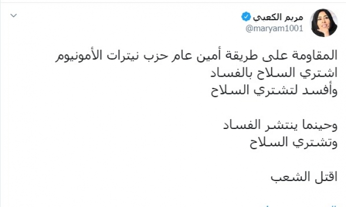سخرت الكاتبة والإعلامية الإماراتية مريم الكعبي، اليوم الأحد، من الإرهابي حسن نصرالله.