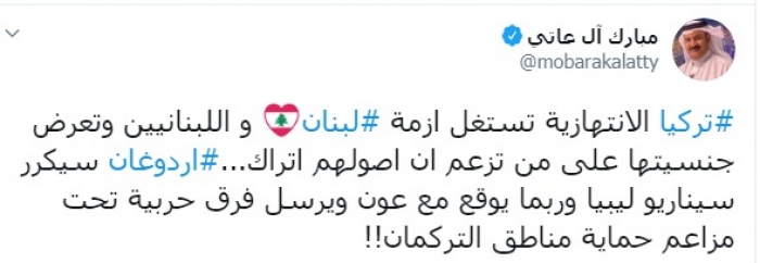 وكتب عبر تغريدة له على "تويتر" رصدها " المشهد العربي": "تركيا الانتهازية تستغل أزمة لبنان و اللبنانيين وتعرض جنسيتها على من تزعم أن أصولهم أتراك".