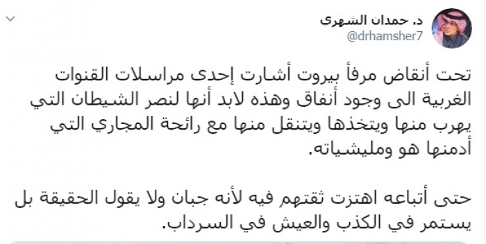 وكتب عبر تغريدة له على "تويتر" رصدها " المشهد العربي": "تحت أنقاض مرفأ بيروت أشارت إحدى مراسلات القنوات الغربية إلى وجود أنفاق وهذه لابد أنها لنصر الشيطان التي يهرب منها ويتخذها ويتنقل منها مع رائحة المجاري التي أدمنها هو ومليشياته، حتى أتباعه اهتزت ثقتهم فيه لأنه جبان ولا يقول الحقيقة بل يستمر في الكذب والعيش في السرداب".