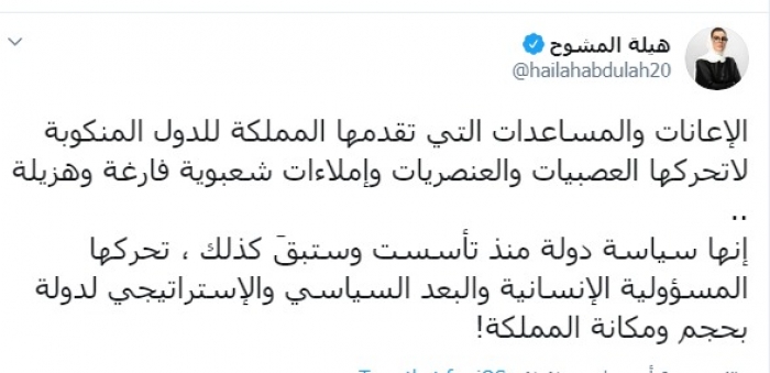 وكتبت عبر تغريدة لها على "تويتر" رصدها " المشهد العربي": "الإعانات والمساعدات التي تقدمها المملكة للدول المنكوبة لا تحركها العصبيات والعنصريات وإملاءات شعبوية فارغة وهزيلة، إنها سياسة دولة منذ تأسست وستبقَ كذلك، تحركها المسؤولية الإنسانية والبعد السياسي والاستراتيجي لدولة بحجم ومكانة المملكة".