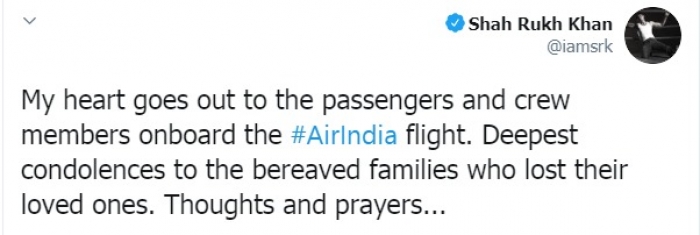 وكتب شاروخان، عبر حسابه الشخصي على موقع "تويتر"، معبرًا عن حزنه الشديد على الضحايا من ركاب وطاقم الطائرة، مضيفة "تعازينا العميقة للأسر الذين فقدوا أحبابهم"، لافتًا أنه يقوم بالدعاء والصلاة لهم.