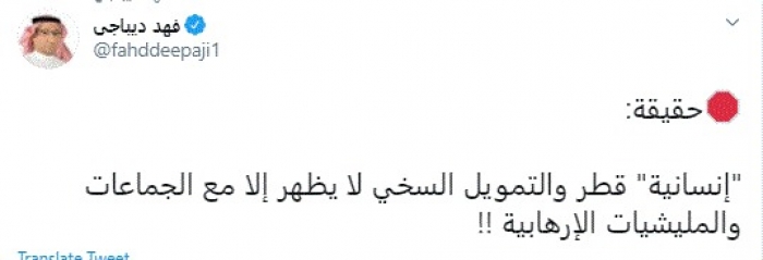 وكتب في تغريدة عبر "تويتر" رصدها "المشهد العربي": "إنسانية قطر والتمويل السخي لا يظهر إلا مع الجماعات والمليشيات الإرهابية".