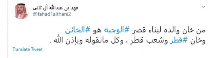 وقال في تغريدة عبر "تويتر" رصدها "المشهد العربي": "من خان والده لبناء قصر الوجبة هو الخائن وخان قطر وشعب قطر، وكل ما نقوله وبإذن الله".