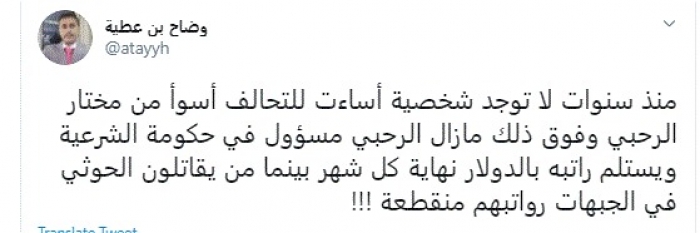وقال في تغريدة عبر "تويتر" رصدها "المشهد العربي": "منذ سنوات لا توجد شخصية أساءت للتحالف أسوأ من مختار الرحبي وفوق ذلك ما زال الرحبي مسؤول في حكومة الشرعية ويستلم راتبه بالدولار نهاية كل شهر بينما من يقاتلون الحوثي في الجبهات رواتبهم منقطعة".