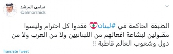 وقال في تغريدة عبر "تويتر" رصدها "المشهد العربي": "الطبقة الحاكمة في لبنان فقدوا كل احترام وليسوا مقبولين لبشاعة أفعالهم من اللبنانيين ولا من العرب ولا من دول وشعوب العالم قاطبة".