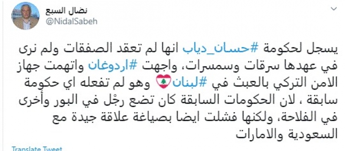 دافع المحلل السياسي اللبناني نضال السبع، اليوم، عن حكومة حسان دياب في لبنان، مؤكدًا أنها واجهت الرئيس التركي رجب طيب أردوغان كما أنها لم يحدث في عهدها سرقات أو صفقات مشبوهة.