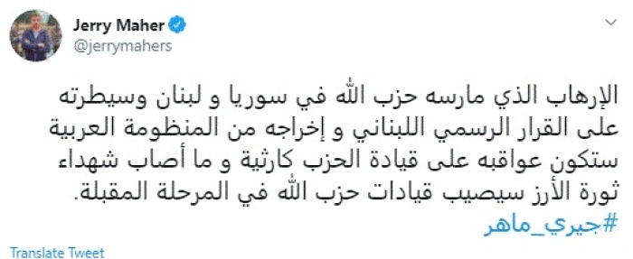 وكتب في تغريدة عبر "تويتر" رصدها "المشهد العربي": "الإرهاب الذي مارسه حزب الله في سوريا ولبنان وسيطرته على القرار الرسمي اللبناني وإخراجه من المنظومة العربية ستكون عواقبه على قيادة الحزب كارثية وما أصاب شهداء ثورة الأرز سيصيب قيادات حزب الله في المرحلة المقبلة".