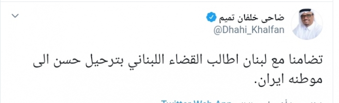 وكتب عبر تغريدة له على "تويتر" رصدها " المشهد العربي": "تضامنا مع لبنان أطالب القضاء اللبناني بترحيل حسن إلى موطنه إيران".