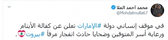 وكتب عبر تغريدة له على "تويتر" رصدها " المشهد العربي": "في موقف إنساني دولة الإمارات تعلن عن كفالة الأيتام ورعاية أسر المتوفين وضحايا حادث انفجار مرفأ بيروت".