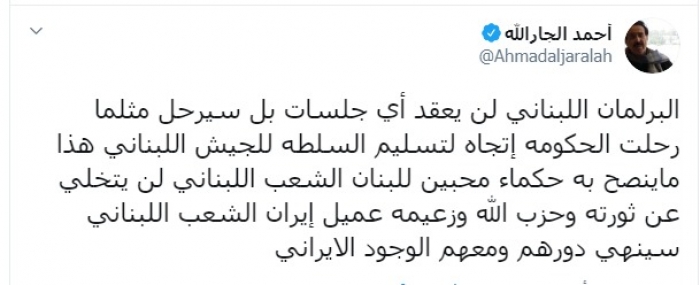 وكتب عبر تغريدة له على "تويتر" رصدها " المشهد العربي": "البرلمان اللبناني لن يعقد أي جلسات بل سيرحل مثلما رحلت الحكومة، اتجاه لتسليم السلطة للجيش اللبناني هذا ما ينصح به حكماء محبين للبنان، الشعب اللبناني لن يتخلى عن ثورته وحزب الله وزعيمه عميل إيران الشعب اللبناني سينهي دورهم ومعهم الوجود الإيراني".