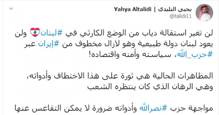 وأضاف: "المظاهرات الحالية هي ثورة على هذا الاختطاف وأدواته، وهي الرهان الذي كان ينتظره الشعب، مواجهة حزب نصرالله وأدواته ضرورة لا يمكن التقاعس عنها".
