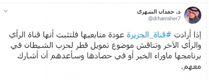 وكتب عبر تغريدة له على "تويتر" رصدها " المشهد العربي": "إذا أرادت قناة الجزيرة عودة متابعيها فلتثبت أنها قناة الرأي والرأي الآخر وتناقش موضوع تمويل قطر لحزب الشيطان في برنامجها ما وراء الخبر أو في حصادها وسأعدهم أن أشارك معهم".