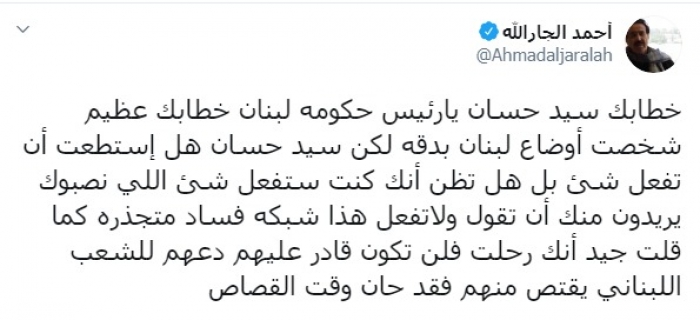 وكتب عبر تغريدة له على "تويتر" رصدها " المشهد العربي": "خطابك سيد حسان يارئيس حكومة لبنان خطابك عظيم شخصت أوضاع لبنان بدقة لكن سيد حسان هل استطعت أن تفعل شيء، بل هل تظن أنك كنت ستفعل شيء، اللي نصبوك يريدون منك أن تقول ولا تفعل، هذه شبكة فساد متجذرة كما قلت، جيد أنك رحلت فلن تكون قادر عليهم دعهم للشعب اللبناني يقتص منهم فقد حان وقت القصاص".