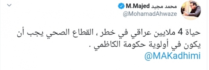 وكتب عبر تغريدة له على "تويتر" رصدها " المشهد العربي": "حياة 4 ملايين عراقي في خطر ، القطاع الصحي يجب أن يكون في أولوية حكومة الكاظمي"
