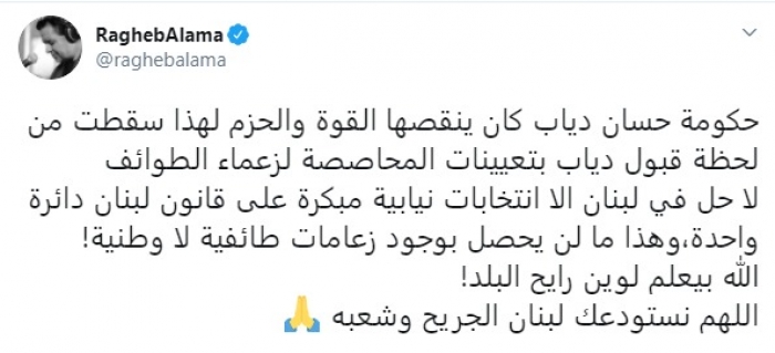 علق المطرب اللبناني راغب علامة على استقالة رئيس وزراء لبنان دكتور حسان دياب.