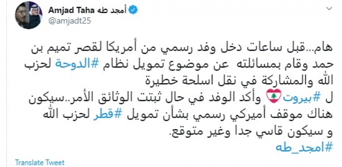وكتب في تغريدة عبر "تويتر" رصدها "المشهد العربي": "هام... قبل ساعات دخل وفد رسمي من أمريكا لقصر تميم بن حمد وقام بمسائلته عن موضوع تمويل نظام الدوحة لحزب الله والمشاركة في نقل أسلحة خطيرة لبيروت وأكد الوفد في حال ثبتت الوثائق الأمر.. سيكون هناك موقف أميركي رسمي بشأن تمويل قطر لحزب الله وسيكون قاسي جدا وغير متوقع".