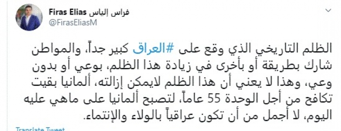 وأضاف: "ألمانيا بقيت تكافح من أجل الوحدة 55 عاماً، لتصبح ألمانيا على ماهي عليه اليوم، لا أجمل من أن تكون عراقياً بالولاء والإنتماء".