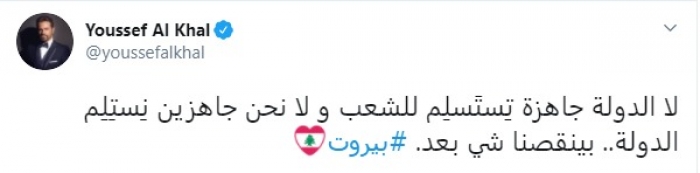وكتب الخال، عبر حسابه على تويتر: "لا الدولة جاهزة تِستَسلِم للشعب، ولا نحن جاهزين نِستِلِم الدولة، بينقصنا شيء بعد بيروت".