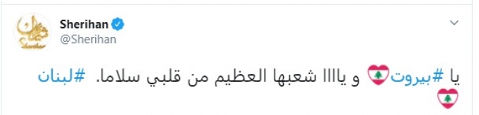 وكتبت شريهان، عبر حسابها على تويتر: "يا بيروت و يا شعبها العظيم.. من قلبي سلاما".