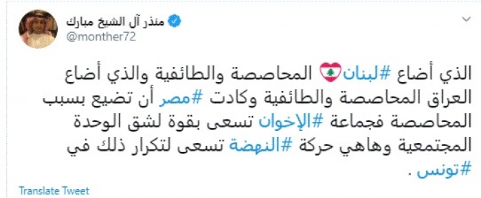 قال المدون السعودي البارز منذر آل الشيخ مبارك، اليوم، إن المحاصصة والطائفية أضاعوا العراق ولبنان، مؤكدًا أن جماعة الإخوان في تونس تسعى لشق الوحدة المجتمعية.