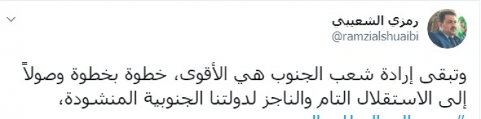وكتب عبر تغريدة له على "تويتر" رصدها " المشهد العربي": "وتبقى إرادة شعب الجنوب هي الأقوى، خطوة بخطوة وصولًا إلى الاستقلال التام والناجز لدولتنا الجنوبية المنشودة".