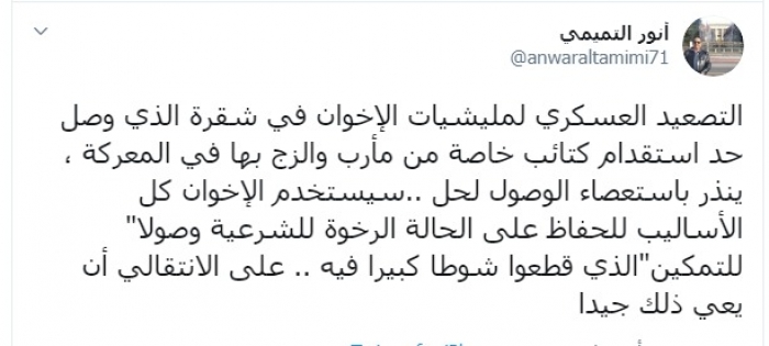 التميمي: هذه دلالة التصعيد العسكري لمليشيا الإخوان في شقرة