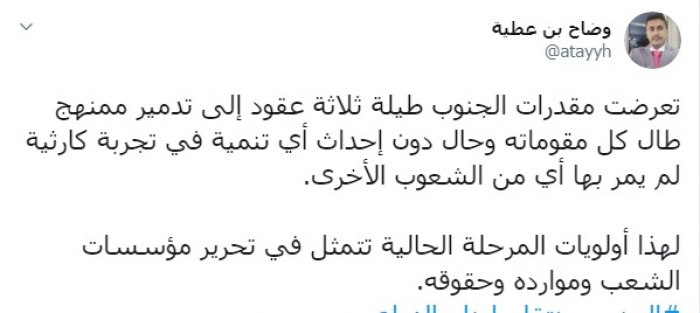 وكتب عبر تغريدة له على "تويتر" رصدها "المشهد العربي": "تعرضت مقدرات الجنوب طيلة ثلاثة عقود إلى تدمير ممنهج طال كل مقوماته وحال دون إحداث أي تنمية في تجربة كارثية لم يمر بها أي من الشعوب الأخرى، لهذا أولويات المرحلة الحالية تتمثل في تحرير مؤسسات الشعب وموارده وحقوقه".