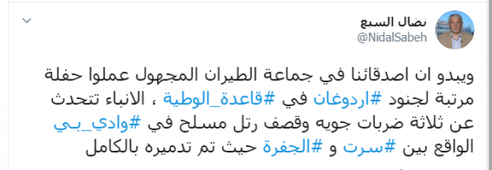وكتب عبر تغريدة له على "تويتر" رصدها " المشهد العربي": "ويبدو أن أصدقائنا في جماعة الطيران المجهول عملوا حفلة مرتبة لجنود أردوغان في قاعدة الوطية، الأنباء تتحدث عن ثلاثة ضربات جوية وقصف رتل مسلح في وادي بـي الواقع بين سرت و الجفرة حيث تم تدميره بالكامل".