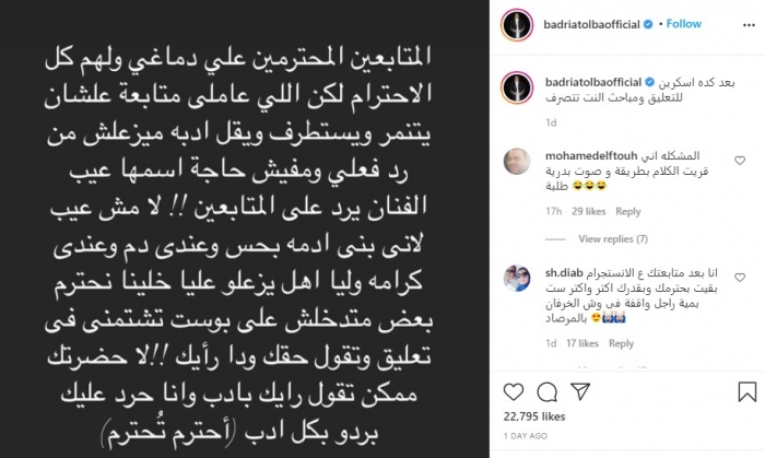 وكتبت بدرية في منشورها :"المتابعين المحترمين على دماغي ولهم كل الاحترام لكن اللي عاملي متابعة علشان يتنمر ويستظرف ويقل أدبه ميزعلش من رد فعلي".