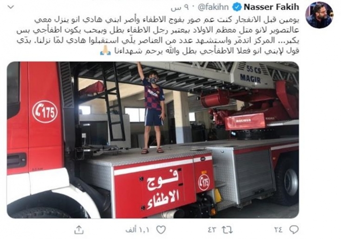 وغرد "فقيه"، عبر تويتر، بصورة لابنه: "يومين قبل الانفجار كنت عم صور بفوج الإطفاء وأصر ابني هادي انو ينزل معي عالتصوير، لأنو متل معظم الأولاد بيعتبر رجل الإطفاء بطل، وبيحب يكون إطفأجي بس يكبر".