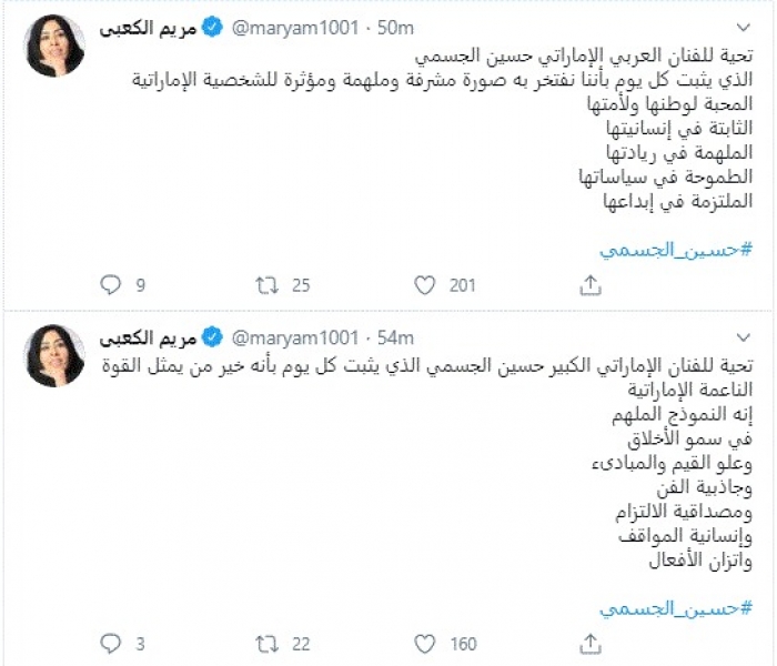 وقالت في تغريدة عبر "تويتر" رصدها "المشهد العربي": "تحية للفنان الإماراتي الكبير حسين الجسمي الذي يثبت كل يوم بأنه خير من يمثل القوة الناعمة الإماراتية إنه النموذج الملهم في سمو الأخلاق وعلو القيم والمبادىء وجاذبية الفن ومصداقية الالتزام وإنسانية المواقف واتزان الأفعال".