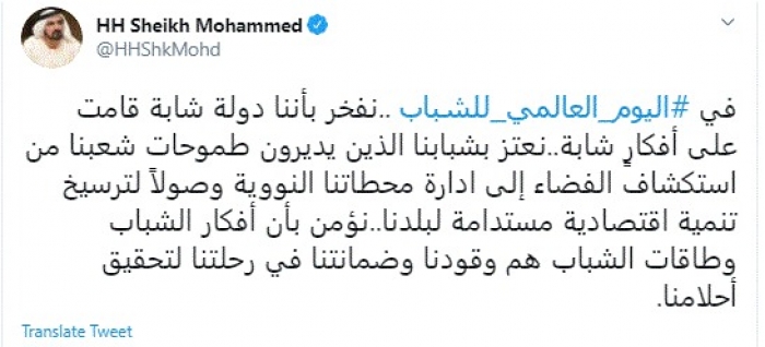 وكتب في تغريدة عبر "تويتر" رصدها "المشهد العربي": "في اليوم العالمي للشباب ..نفخر بأننا دولة شابة قامت على أفكارٍ شابة..نعتز بشبابنا الذين يديرون طموحات شعبنا من استكشاف الفضاء إلى ادارة محطاتنا النووية وصولاً لترسيخ تنمية اقتصادية مستدامة لبلدنا".