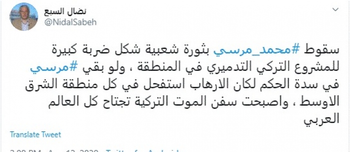 قال المحلل السياسي اللبناني نضال السبع، اليوم، إن سقوط الرئيس المصري الراحل محمد مرسي شكل ضربة كبيرة للمشروع التركي التدميري في المنطقة العربية.