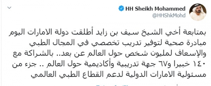 وكتب عبر تغريدة له على "تويتر" رصدها " المشهد العربي": "بمتابعة أخي الشيخ سيف بن زايد أطلقت دولة الإمارات اليوم مبادرة صحية لتوفير تدريب تخصصي في المجال الطبي والإسعاف لمليون شخص حول العالم عن بعد، بالشراكة مع ١٤٠ خبيرا و٦٧ جهة تدريبية وأكاديمية حول العالم، جزء من مسئولية الإمارات الدولية لدعم القطاع الطبي العالمي".
