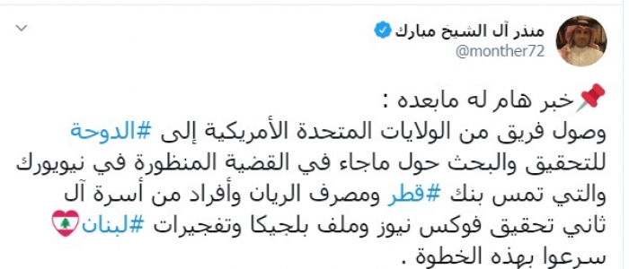 وكتب عبر تغريدة له على "تويتر" رصدها " المشهد العربي": "خبر هام له مابعده، وصول فريق من الولايات المتحدة الأمريكية إلى الدوحة للتحقيق والبحث حول ما جاء في القضية المنظورة في نيويورك والتي تمس بنك قطر ومصرف الريان وأفراد من أسرة آل ثاني تحقيق فوكس نيوز وملف بلجيكا وتفجيرات لبنان سرعوا بهذه الخطوة".
