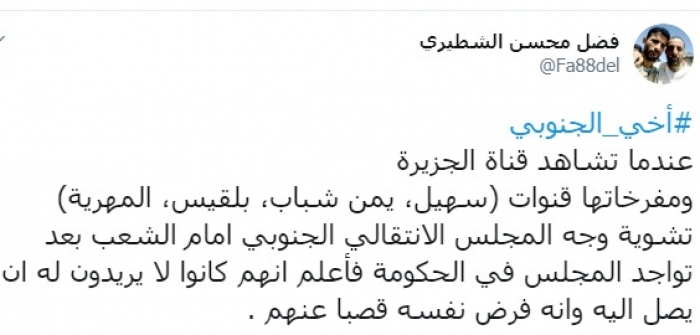 وكتب عبر تغريدة له على "تويتر" رصدها "المشهد العربي": "عندما تشاهد قناة الجزيرة ومفرخاتها قنوات (سهيل، يمن شباب، بلقيس، المهرية)، تشوه وجه المجلس الانتقالي الجنوبي أمام الشعب بعد تواجد المجلس في الحكومة فاعلم أنهم كانوا لا يريدون له أن يصل إليه وأنه فرض نفسه غصبا عنهم".