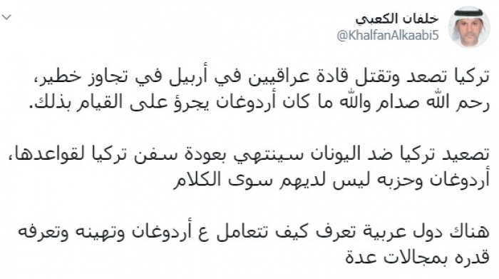 وكتب عبر تغريدة له على "تويتر" رصدها " المشهد العربي": "تركيا تصعد وتقتل قادة عراقيين في أربيل في تجاوز خطير، رحم الله صدام والله ما كان أردوغان يجرؤ على القيام بذلك، تصعيد تركيا ضد اليونان سينتهي بعودة سفن تركيا لقواعدها، أردوغان وحزبه ليس لديهم سوى الكلام، هناك دول عربية تعرف كيف تتعامل مع أردوغان وتهينه وتعرفه قدره بمجالات عدة".