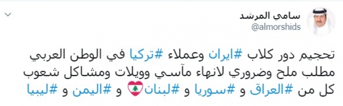 وكتب عبر تغريدة له على تويتر" رصدها " المشهد العربي": "تحجيم دور..إيران وعملاء تركيا في الوطن العربي مطلب ملح وضروري لإنهاء مآسي وويلات ومشاكل شعوب كل من العراق و سوريا و لبنان و اليمن و ليبيا".