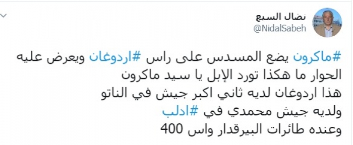 وكتب عبر تغريدة له على "تويتر" رصدها " المشهد العربي": "ماكرون يضع المسدس على رأس أردوغان ويعرض عليه الحوار ما هكذا تورد الإبل يا سيد ماكرون، هذا أردوغان لديه ثاني أكبر جيش في الناتو، ولديه جيش محمدي في أدلب، وعنده طائرات البيرقدار واس 400".